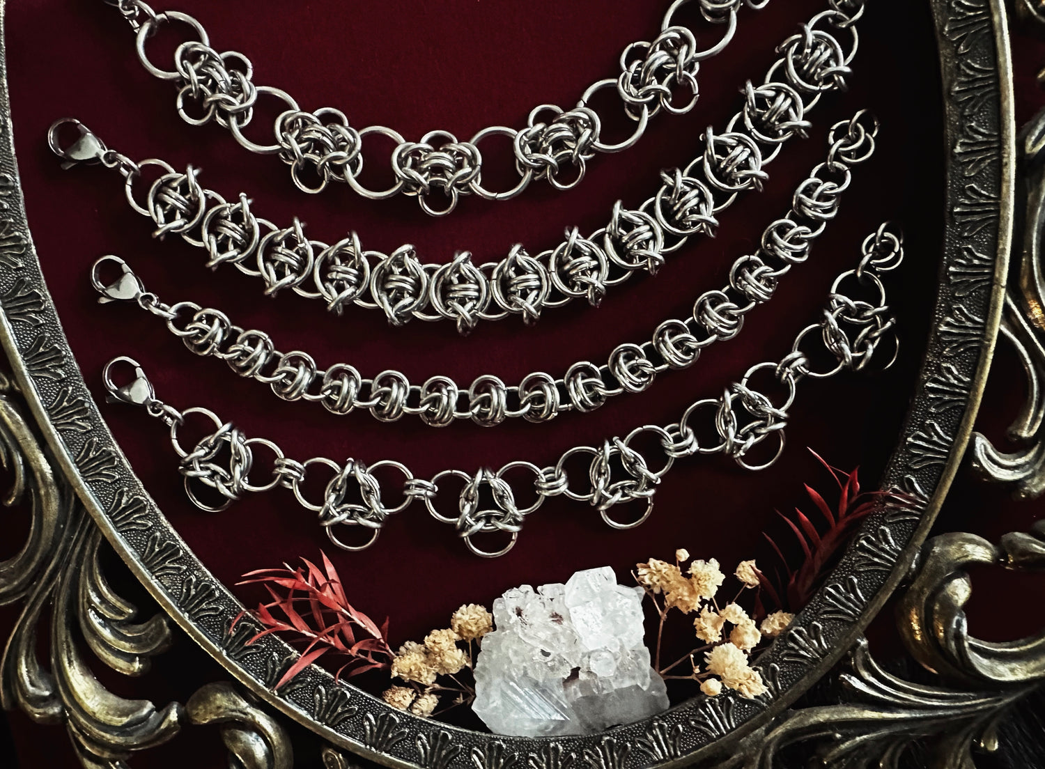 You might be familiar with chainmaille armor but that's not the end of the capabilities of this art. Revitalize the ancient craft of chainmaille with a modern spin. Discover a distinctive assortment of jewelry and accessories for a bold new aesthetic. Each piece is crafted with attention to detail. Immerse yourself in the rich history and tradition of chainmaille, reimagined for the contemporary wearer.